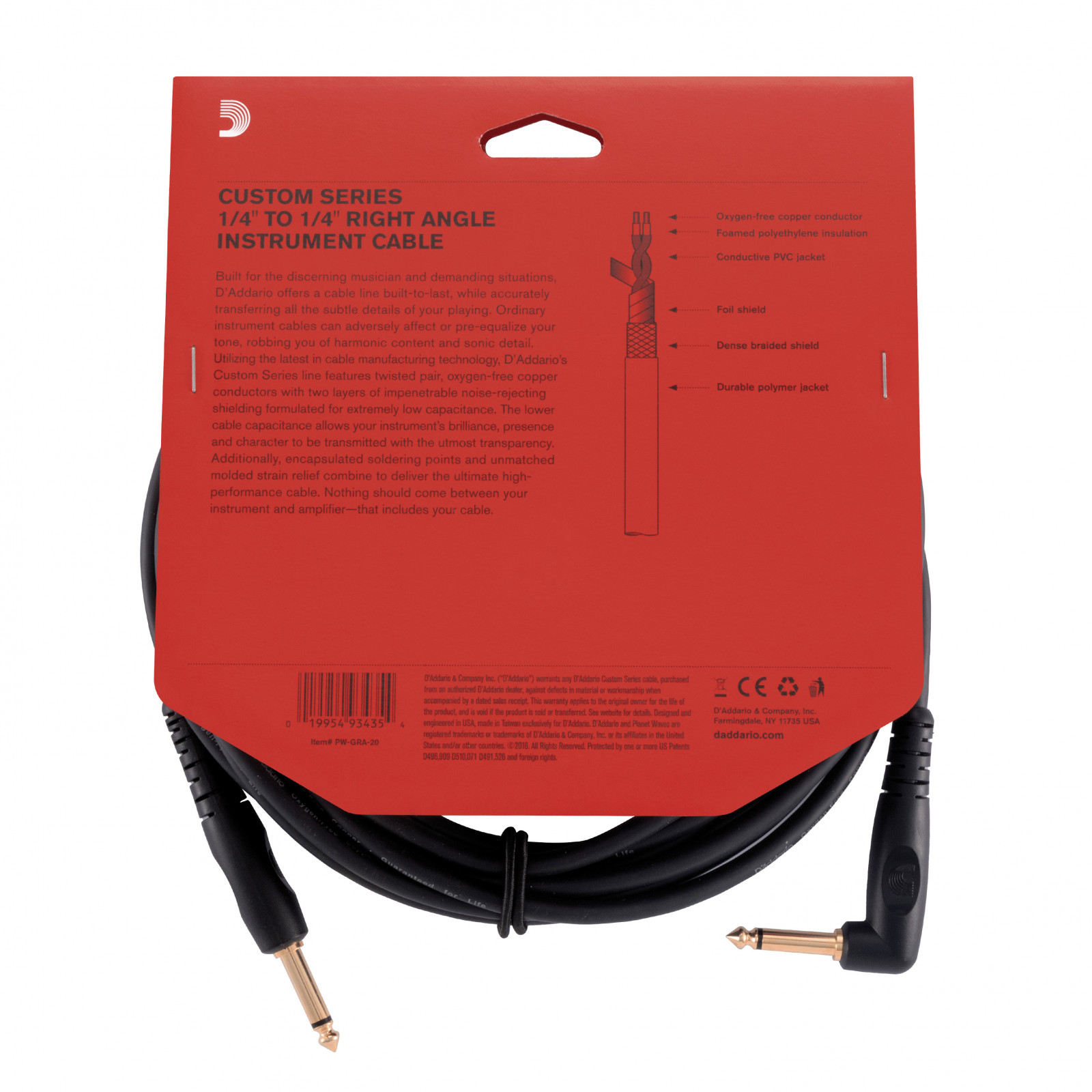 D'Addario Planet Waves GRA-20 - Cable instrument jack coudé Custom noir 6m